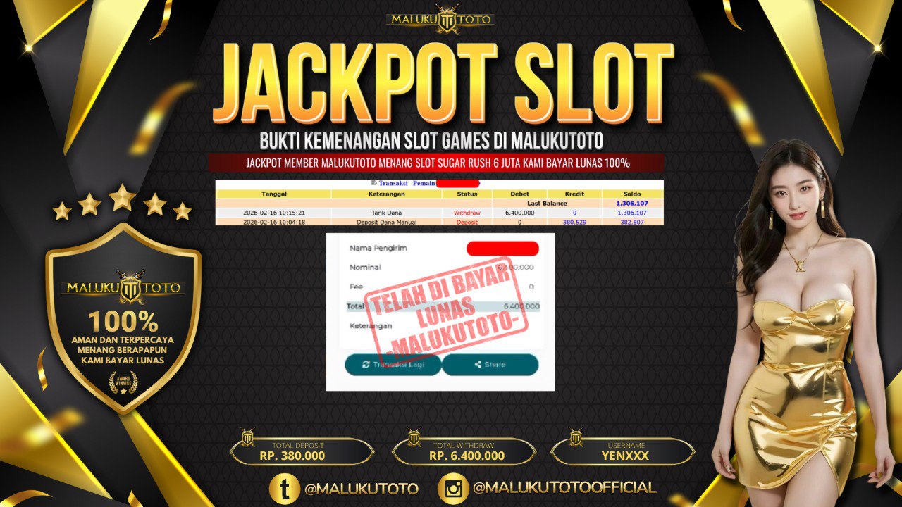 Selamat kepada User id : YEN*** Telah berhasil mendapatkan kemenangan besar pada permainan SLOT SUGAR RUSH kemenangan Sebesar Rp.6.400.000, Setelah mengisi formulir withdraw dengan kurung waktu hanya 3 – 5 menit pihak malukutoto sudah melakukan transfer kepada pemilik Userid dan dana sudah dapat di cairkan oleh pemenang. Bukti pembayaran yang kami berikan merupakan bukti pembayaran yang SAH / VALID yang langung di dapatkan melaui tanda transfer transaksi dari Bank yang di tuju.